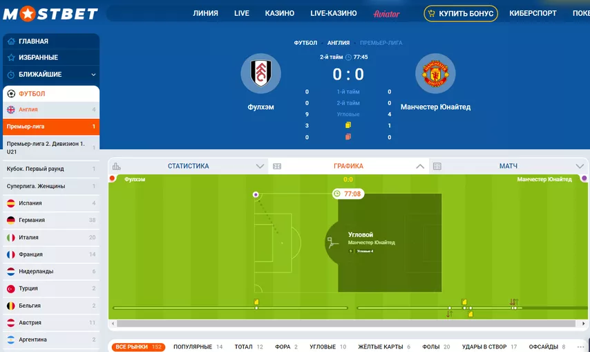 В live-разделе каждый день доступны сотни матчей. Вариативность росписи зависит от популярности. В футболе – 100-1,400 рынков, в хоккее – 10-200, в теннисе 10-50. Основу росписи составляют тоталы и форы. Почти во всех матчах есть опция поставить на точный счет и двойной шанс. В топовых футбольных встречах – десятки комбинированных пари. Плюсы Мостбет: