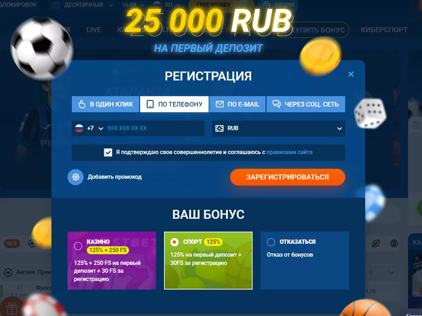 • 100%-125% на первый депозит плюс 30 бесплатных вращений в слотах казино. Максимальный бонус – 25,000 ₽. Отыграть нужно в пятикратном размере. Учитываются только экспрессы с тремя и более событиями на исходы с коэффициентами от 1.4.